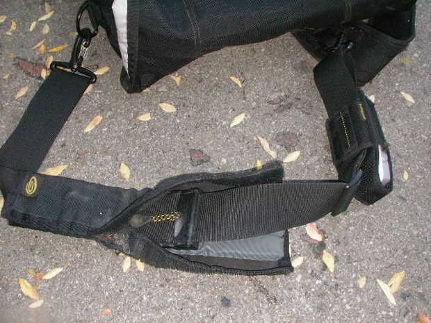 no tan bueno. la abrazadera de ajuste tiende a estallar abierto y dejar salir todo el juego justo cuando no lo desea (es decir, siempre). Si usted tiene o consigue un cojín de hombro, se puede mejorar esto un poco. Yo tuve uno de uno de mis bolsos viejos de timbuktu.