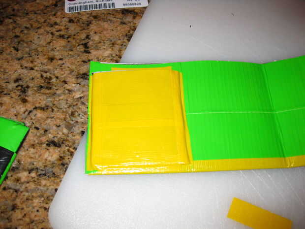 Primero tomar 2 tiras de cinta adhesiva para conductos (anchura de alrededor de 3 tarjetas de crédito con una pulgada de superávit) y superponer un poco otra vez, corte hasta alittle más corto que la tarjeta. Ahora en la esquina inferior derecha hacen un pequeño corte hacia fuera (esto es por lo que uno es mayor). Luego doblar por lo que tiene 3 ranuras para tarjetas y cinta los bordes y cinta adhesiva en donde quieras en la cartera. Si su demasiado grande entonces usted puede cortar el exceso según sea necesario.