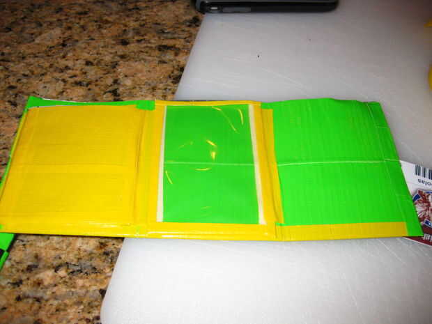 Cartera intermedia y bastante gruesa. Tiene un bolsillo de ID, un bolsillo secreto, 4 otros bolsillos y una billetera. Tarda unos 30 minutos para hacer, y todo lo que necesitas es cinta aislante y cinta de claro. También podría tener Velcro. Sugiero