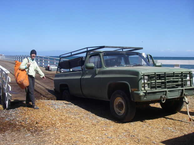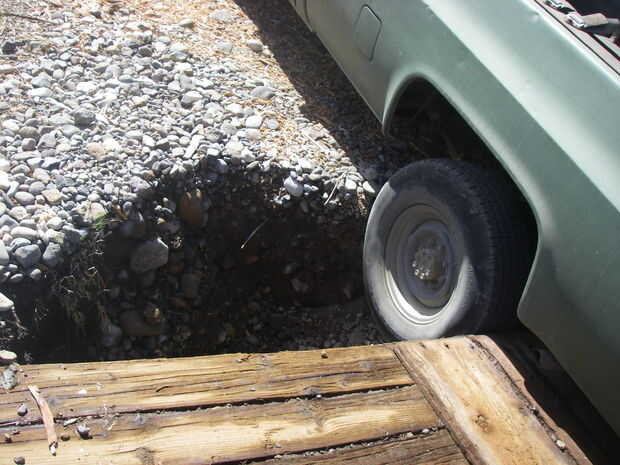 Como el ferry se acerca, un camión se conduce hasta el muelle. Ola y detrás de la sonrisa. Cuando a continuación lo vemos ha caído en un agujero. Tormenta olas socavaron la carretera hasta el muelle y la carretera se derrumbó cuando conducían en él.