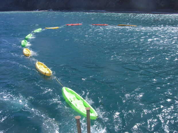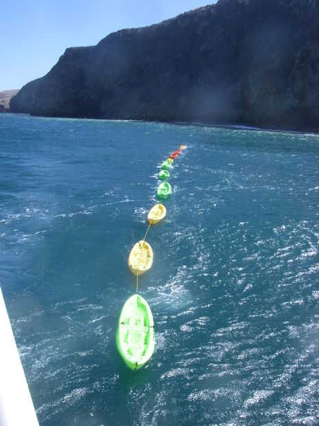 Paramos en el Rancho de escorpión para recoger cientos de campistas y kayaks de una docena. Uno de los guías remaron hacia fuera tirando de una cadena de kayaks. Se izó uno por uno y trincadas en la popa del ferry. Los guías estaban en su elemento. Mientras esto se va en la línea de pasajeros en el muelle hizo una brigada del cubo da su montaña de equipaje en el barco antes de entrar en sí mismos.