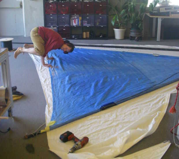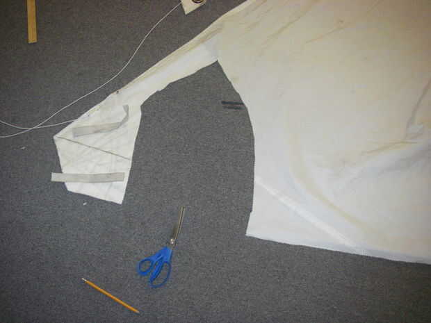 Antes de tiempo un montón de tela dispersada en el piso. Cortar un parche para reforzar una de las esquinas de la vela. Entonces cuando fui a coser me enteré donde corté el parche de la esquina. ¡ Oh no! ¡ Uy! Afortunadamente fue abundante material de parche, y esta vela es parchada y reparado un par de maneras diferentes antes de que alguna vez ha utilizado. Sí, más fuerte en los lugares rotos y lo que mata no hacen más fuerte, y cuando mueres en la vida real las paradas de sueño, o algo como eso. ¿Qué pasó con mi cerebro?