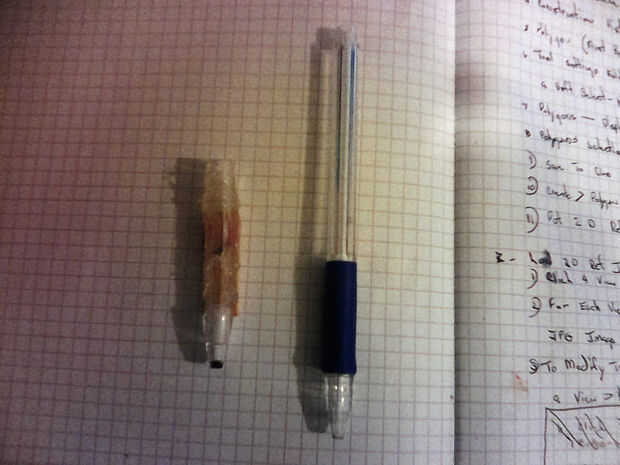 Ahora mis amigos, tomar una mirada cercana real en el eje z, la segunda foto muestra realmente el detalle, lo que he hecho es desmontar un bolígrafo de tinta, corte la parte inferior por la mitad, la parte inferior es la parte con la empuñadura de goma en él, la parte que tiene la mugre pegamento en él por el uso anterior, ahora debemos tener 2 partes que queremos un aprox 1/2 del cañón de la pluma de orig y 2 la acarreo de tinta que se quitó.