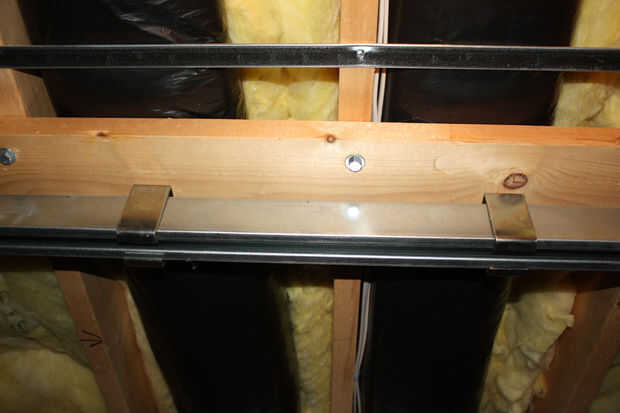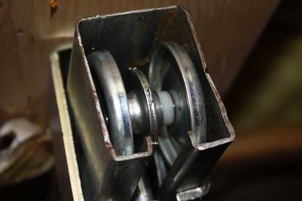 El hardware que utiliza fue hecho por Stanley y consistió en un carril y un carro que montó en el tren. Había varios carros diferentes disponibles, pero el carro elegir era similar al actual modelo 5001, que tenía 4 ruedas de acero, cojinetes Delrin y un perno de 7/16"-14 suspendido de él. El carro iba a ser atornillado a un soporte de conexión para la puerta del establo, permitiendo que la puerta de granero se deslice a lo largo del riel para abrir y cerrar. El carril están disponibles en longitudes desde 6' a 24', para cubrir cualquier necesidad. El 5114 llanas caja riel está valorado en 600 libras, y decidí utilizar 3 de ellos, dándome un total de 1800 libras de almacenamiento en mi ser. Los carros, "5001 caja carril suspensiones", están clasificados en 225 libras cada uno, y estaba usando 6 por estante, para un total de 1350 libras. Pensé que sería más que suficiente.