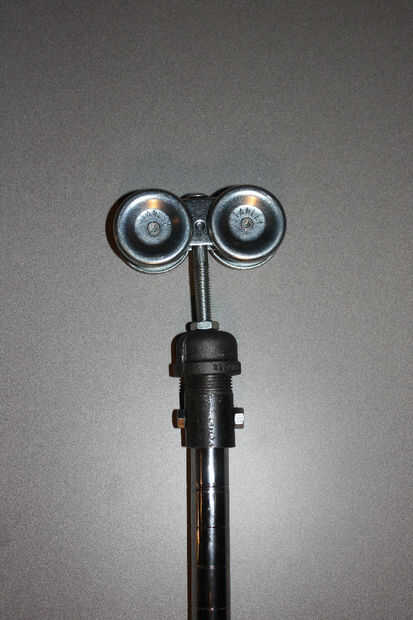 Mientras que vaga alrededor de la tienda se me ocurrió una idea! Cogí algunos 1" id negro niples, que ajuste bien alrededor de los montantes. Quisiera perforar y atravesar pernos en la parte superior de cada montante, luego atornillar un casquillo de la pipa negra en el extremo del pezón, perforar para el tornillo de carro y conectar todo. La tercera imagen muestra el producto final.