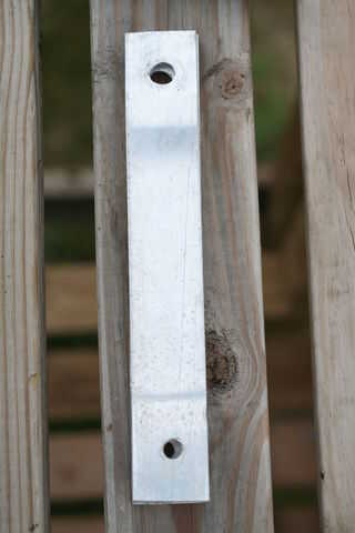 Después apilar las 2 piezas encima de la otra y taladre los agujeros. En un extremo tienes que taladrar un orificio de 3/8". En el otro extremo haga su agujero 5/16". Usted debe terminar con algo que se ve así: