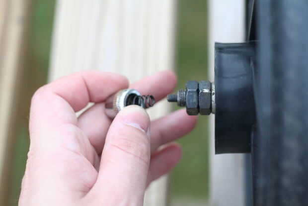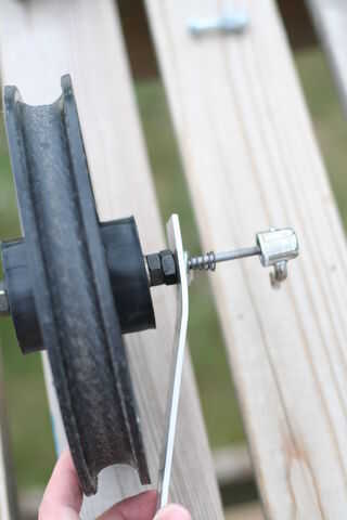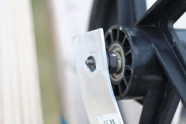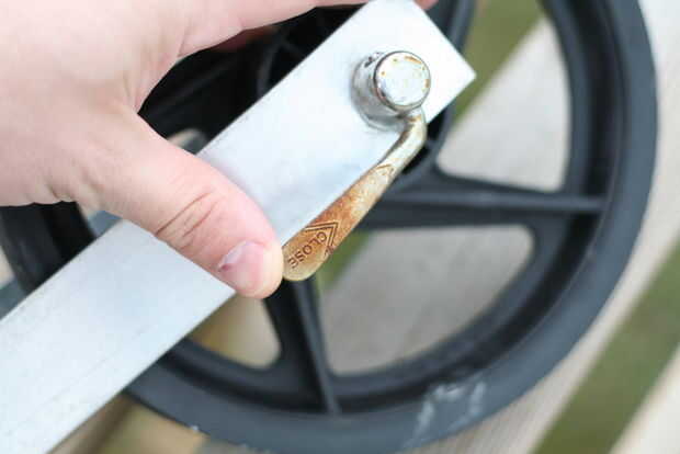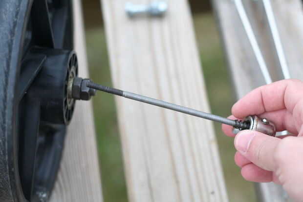 Inserte la broqueta a través del orificio de 3/8" en el extremo de una barra y luego por el eje de la rueda. Asegúrese de que tiene la barra orientada correctamente para que se dobla hacia el borde de la rueda. (imagen 4)