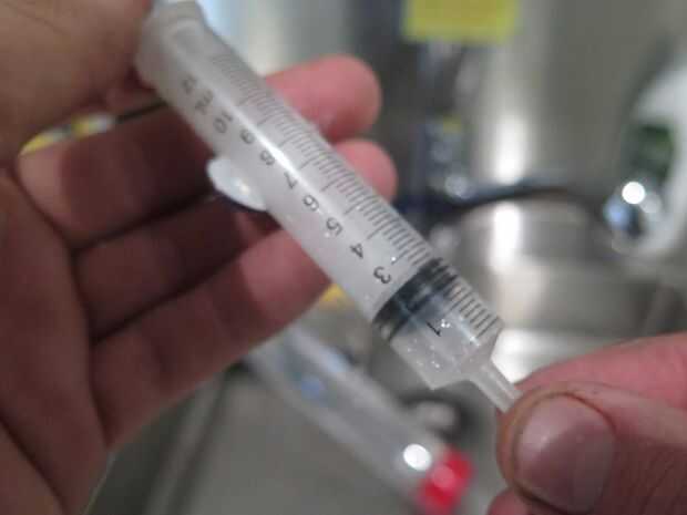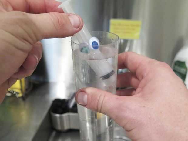 Tapa un extremo del tubo y llenarla casi hasta arriba con agua. Tirar de los émbolos de las jeringas para darles una bolsa de aire. Esto les permitirá flotar a la superficie. El volumen que usted elija es y para variar y experimentar con el. La apertura de la jeringa es lo suficientemente estrecha como para que agua no colarse en el bolsillo de aire, que es bastante ingenioso.
