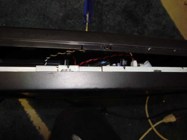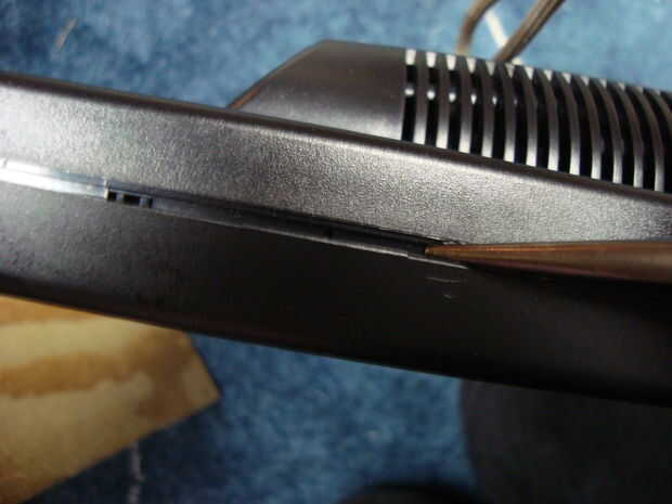 Esto es específicamente para el Optiquest Q9B, pero estoy seguro de que la mayoría de la gente podría resolver esto. En primer lugar, sacar la parte de plástico sobre la bisagra para el stand. A continuación, quite los dos tornillos que se muestra en la imagen. Ahora, todo lo que tienes que hacer es quitar las dos mitades separadas con alguna manera, forma, o forma de alzaprimar implementar. Deben desarmarse fácilmente. Asegúrese de no romper ningún cable conectado posiblemente entre el frente y las mitades de nuevo. Normalmente son cables de altavoces, y no encuentro que son muy importantes ya que utilizar altavoces externos, pero aún así tratar de tener cuidado. La fuente de alimentación generalmente está cubierta, así que sacar la tapa. Ahora Asegúrese de desconectar cualquier cable va a la fuente de alimentación y llevarlo a cabo.