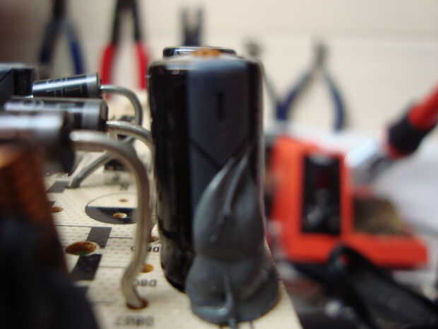 Ahora, en la alimentación, debería ver un montón de condensadores. La mayoría de ellos se ven normal, pero usted está buscando un condensador que tiene un líquido de color marrón amarillento crujiente saliendo de la parte superior o abultamiento en la parte superior. El cuadro mostrará lo mejor que puedo describirlo.