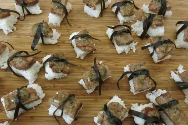 Años más tarde, estaba en una gasolinera en Hawaii y mucha hambre. Bajo la lámpara de calor fueron los perros caliente opciones habituales, burritos y luego SPAM, sirve sobre arroz de sushi y con una astilla de la alga marina mantiene juntos. Yo había oído hablar de este este este - - cumple-estañado-grapa de carne conocida como masubi. Parecía la opción más segura de la bombilla - buffet cocinado. Tenía una dulce teriyaki salsa equilibrada la sal, y a pesar de mis prejuicios, lo disfruté. SPAM utiliza ajuste de cerdo que normalmente va a la basura, por lo que era un adaptador temprano en nuestra creciente conciencia sobre la basura de alimento. Me puse a hacer mi propio correo basura, con menos sal, pero siguen usando partes del animal que normalmente se desperdician. Así que hice uno de manitas de cerdo y un salmón SPAM de cuellos, barrigas y las colas.
