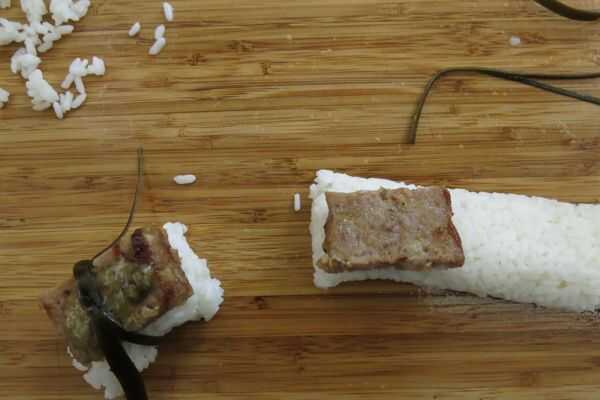 Tomar unos trozos grandes de kombu y cortarlas en rodajas finas. Utilizar éstos para atar para arriba el arroz y el SPAM.
