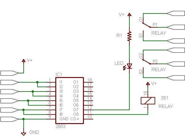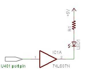 El sitio de USBmicro tenía una guía para conducir un LED desde el pin de salida de un U401 o U421. Extensión para utilizar un ULN2803 para este proyecto fue fácil. Una de las notas de aplicación en el USBmicro también tiene un ULN2803 conducción LEDs y relés. Ambos fragmentos esquemáticos son foto abajo para servir como una guía.