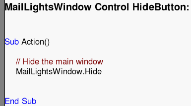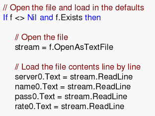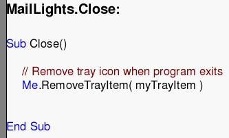 Después de se busca un archivo llamado "maildata.txt" en el mismo directorio como el ejecutable maillight.exe. Otra vez, en un programa que no sea de código de ejemplo, debe existir más código para controlar los errores tales como el archivo no se encuentra.
