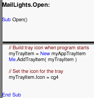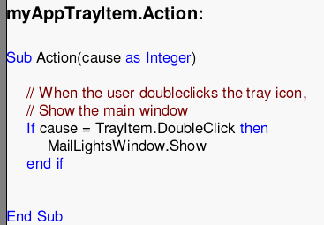 El objeto de la bandeja de aplicación sí mismo tiene solamente la tarea de hacer visible la ventana principal cuando el usuario hace doble clic en el icono de la bandeja: (ver foto)