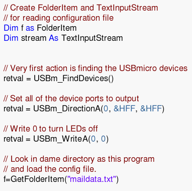 USBm_FindDevices es la primera llamada a USBm.dll. Busca autobús del USB de la PC para dispositivos U401 y U421. En este simplificado código de ejemplo que no se utiliza el código de retorno de verdadero o falso. Código de ejemplo no quiere procesar los valores de retorno de error. A Puerto de la U421 se encuentra a la salida con esta llamada: USBm_DirectionA (0 & HFF & HFF). El 0 se supone que hay sólo 1 (indexado a 0) dispositivo de USBmicro en el bus. Si hubiera más, código adicional sería necesario abordar el dispositivo correcto. Consulte la información de USBmicro en el Cuaderno de desarrollo on-line (ODN) de toda la información de comando de dirección de puerto.