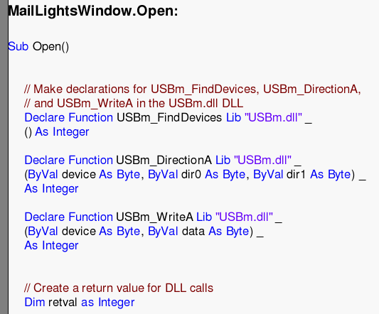 Cuando el formulario principal se hace visible por primera vez que se ejecuta el programa, el interfaz del USB de U421 se descubre y se cargan los valores por defecto para el programa. Comunicación con la U421 se realiza a través de una DLL que se abre por REALbasic cuando se define la función dentro de esa DLL. El código primero declara las tres funciones necesarias (y crea un valor devuelto por la función llamada) antes de utilizar las funciones: (ver foto)