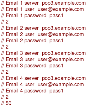 El archivo contiene la información de texto que se lee en los cuadros de texto en la ventana principal. La primera línea del archivo debe contener el nombre del servidor de correo electrónico 1, la segunda línea debe tener el nombre de usuario, etc.. La última línea tiene la tasa de parpadeo del LED. Los comentarios en el código de mostrar el formato: (ver foto)