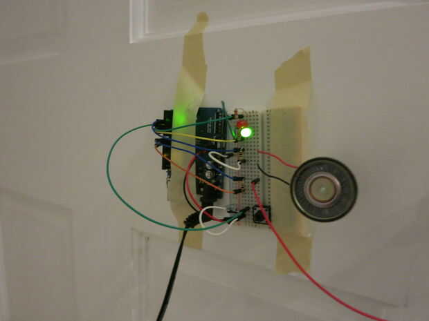 Ahora presione el botón de reset en su Arduino y colocar el aparejo entero en la puerta. Que cinta como yo o llegar a un recinto de aspecto más agradable. Cinta del papel de estaño a las base de pomos o enróllelo alrededor de una protuberancia o tornillo, sólo tratar de hacer así que usted puede todavía gire el fácilmente, pero para que el estaño todavía toca metal. En este punto, también configurar el sistema de poder. Puede utilizar una fuente de alimentación de la pared, sólo asegúrese de que está entre 7 y 12 voltios y puede suministrar suficiente corriente. Alternativamente, puede usar una batería otra vez comprobando que es entre 7 y 12 voltios. Una vez que todo se ve bien puede presione y mantenga presionado el botón para que el led verde comienza a parpadear. Ahora, tocar el pomo y escuche la alarma.