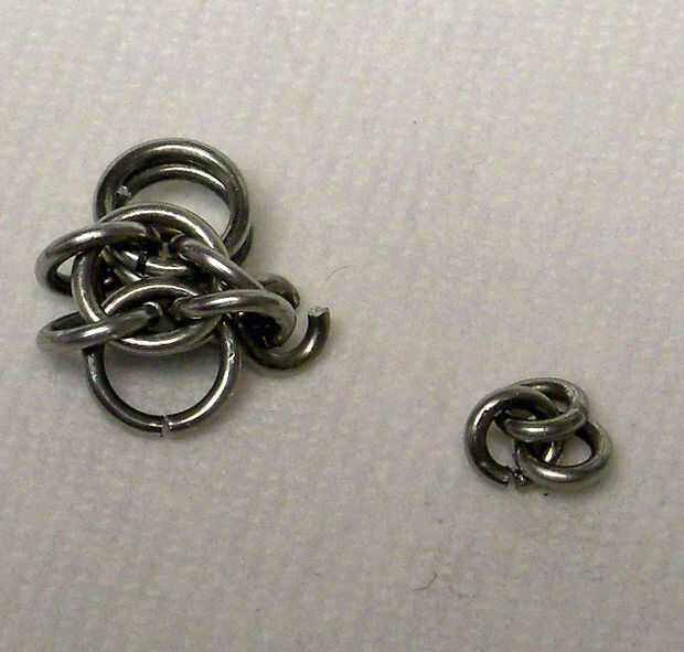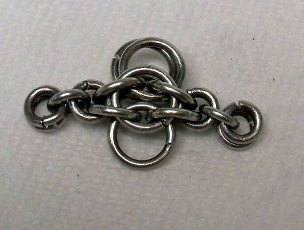 2. Inserte un pequeño anillo abierto en dos anillos de media en el lado de la cabeza/tronco (= la articulación del hombro) y conecte el mismo anillo pequeño en el extremo del anillo único del brazo. Anillo pequeño cercano.