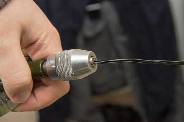 Coloque uno de los extremos de los cuatro cables en una abrazadera y los otros extremos de los cuatro cables en el portabrocas de un taladro. Para esto usé una mano movía el taladro, pero eléctrico trabajará demasiado, sólo asegúrese de que su en una velocidad más lenta.