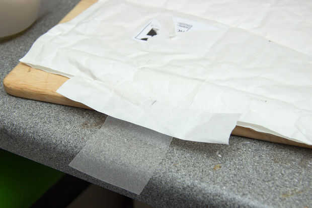 Siguiente, usa cinta de doble cara Acople la base capas/perforada en la parte inferior de la envolvente, recuerde que usted quiere hacer esto a la parte trasera, no lo cortan un panel de.