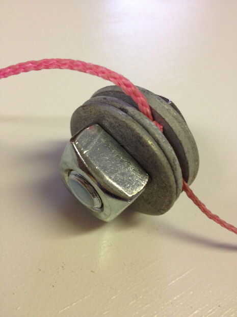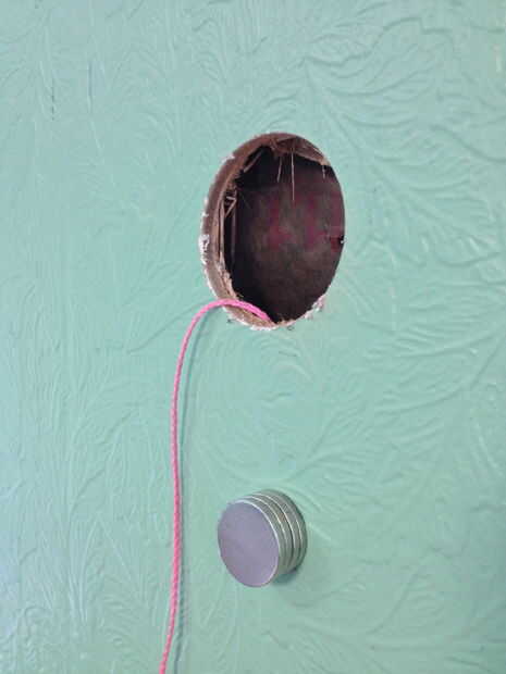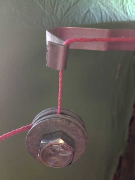 Los imanes hacen brevemente el trabajo de ejecutar la primera cuerda ya que puede guiar el perno y las arandelas abajo la pared a su agujero de salida. La parte más difícil fue pasar los pernos y arandelas a través de los postes de madera y colocar entre los paneles de la madera y el aislamiento dentro de la pared. Si está trabajando en una pared interior, esto no será un problema como paredes sólo exteriores están aisladas. En general, no es muy difícil de colocar y orientar la cadena hacia el orificio de salida cerca de la planta.