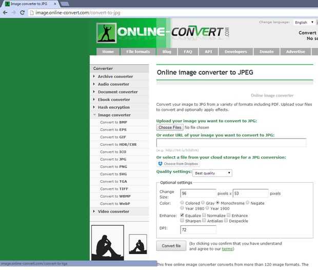 Para ello, primero vaya a http://image.online-convert.com/convert-to-jpg y convertir individualmente cada imagen utilizando los ajustes mostrados en el cuadro de referencia.