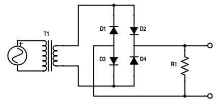 La tensión reducida del transformador ahora pasa por uno de los diodos. Recuerde que los diodos solo permiten actuales para fluir en una dirección (por lo tanto, la forma de flecha). Por lo tanto, qué diodo, la corriente fluirá a través de depende de si la tensión está en la mitad positiva del ciclo o la mitad negativa. Durante la parte positiva del ciclo coseno de la tensión de la corriente fluye a través de D2 y D3. Durante la mitad negativa, la corriente fluye a través de D1 y D4. Sin embargo la tensión en los extremos tiene siempre la misma polaridad. Por lo tanto esta parte del circuito efectivamente nos da el valor absoluto de la tensión de entrada coseno (después de ser caminado por el transformador) menos 2 gotas de diodo de tensión (recordemos que la caída de tensión en los diodos es prácticamente constante y ~ 0. 65 V).