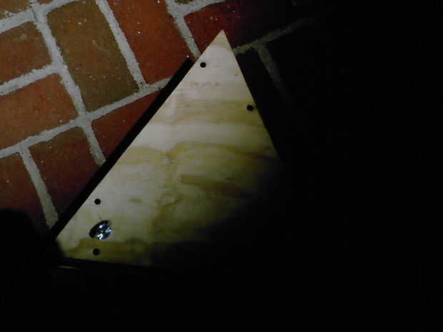Taladre un agujero de diámetro 5/16 de pulgada sobre la pieza superior de la madera contrachapada de 3/4 de pulgada cerca de uno de los vértices del triángulo.  Instale el perno de ojo a la madera contrachapada de 3/4 de pulgada con una arandela, arandela y tuerca.  Fije la madera superior a la base con tornillos de drywall de 1,25 pulgadas 2 x 3 pulgadas.