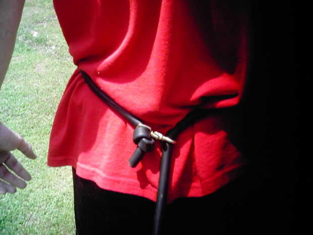 Corte 8 pies de tubo de goma de alta resistencia.  En cada extremo de la tubería de goma, deslice cerca de 4 pulgadas de la tubería a través de la pieza de la manija de su clip.  En el lado de cuatro pulgadas de la tubería de goma, atar la tubería en un nudo.  Ahora tienes un pedazo de tubo de goma de 8 pies con clips en cada extremo.  Acople un extremo del tubo de goma para el perno de ojo en la parte superior del carro.  Envuelva el otro extremo alrededor de la cintura del corredor y fíjelo con el clip de otros.