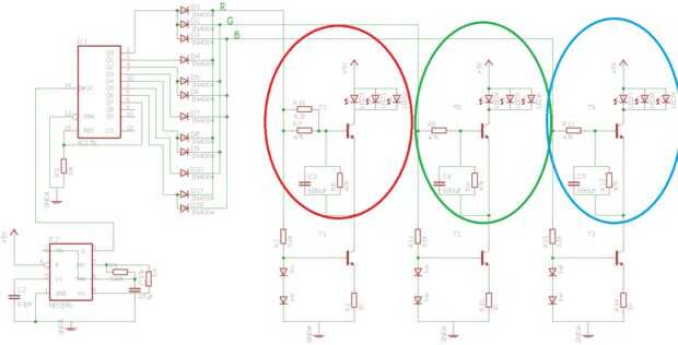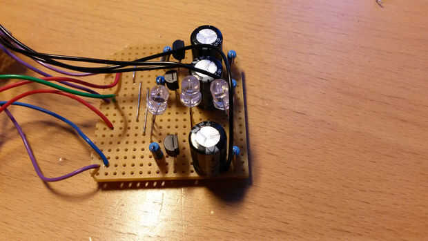 El circuito de fadeing es muy simple y por desgracia, no tan bueno. Más detalles del circuito aquí: transistor Simple fade en/poner circuito. Como resistencias utilicé R1 = 47k, R2 = 47k, C1 = 680 uF. El problema es que los leds se descolora en/hacia fuera demasiado rápido y la demora de inicio, que es causada por que el condensador tiene a cargo los 6 adelante voltaje hace apagado en la secuencia. Si le hago el circuito otra vez el circuito de atenuación sería mejor hecho.