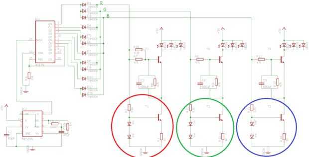En lugar de usar resistencias para controlar el LED actuales, hice estos circuitos de transistor de trabajo súper fácil, pero muy bueno. Cada LED dispone de propio control actual it´s. La corriente puede pasar el circuito tanto como quiere hasta que se cumple la consigna. Entonces la corriente por el LED se limita al valor de ajuste. En este circuito el valor de consigna es cerca de 60 mA, porque siempre hay 3 LED en paralelo (20 + 20 + 20 mA).