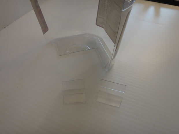 - Tomar el recipiente de plástico con los lados cuadrados y cortar 4 piezas de ángulo recto, cada 1" 1 ½" de ancho.