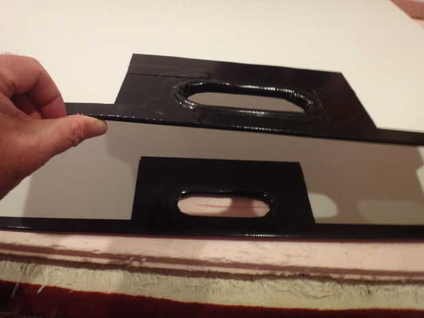 - La parte inferior de la aleta de la parte trasera a la parte inferior del transportador para crear un borde de 90 grados entre la parte posterior del habitáculo y la parte inferior de la cinta. Reforzarlo con cinta dentro y fuera.
