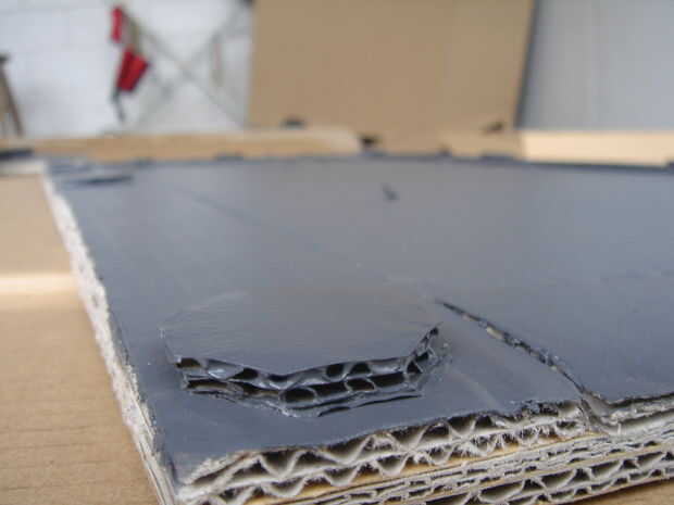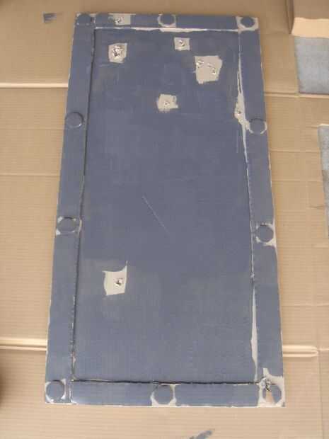 Pintar el escudo con la pintura negra, asegurándose de no aplanar los agujeros de bala, luego con un pincel más pequeño, se pintar los agujeros y los bordes. Probablemente tendrá 2 o 3 capas para cubrir bien la tarjeta. Recuerde que es mucho mejor hacer 3 capas más delgadas que una gruesa. Una vez hecho esto, dejar el escudo en el sol para secar. Mucha pintura se utilizará en este paso ya que la tarjeta es absorbente pero su esencial que le das el escudo esta capa sella el escudo y proporciona una base para la pintura de aerosol.
