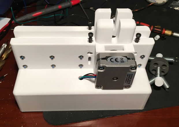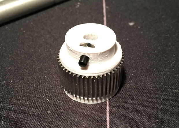 Después del pegamento estupendo de las dos partes impresas 3D a un engranaje (Asegúrese de que el D cortes para el eje se alinea correctamente en ambos lados), instalar en el eje de paso a paso. No necesita incluso apretar en el tornillo como la fricción debe mantenerlo en su lugar. Pruebe la colocación de los pasos en el cuerpo (que debe haber ya atornilladas las 3 piezas del cuerpo principal) y asegúrese de que el equipo está centrado en la ranura de la cinta. Cuando mira hacia abajo desde la parte superior, usted no debe poder ver cualquiera de la 3-d imprimir partes a ambos lados de la marcha, pero sólo el engranaje. Una vez que estés satisfecho apriete el tornillo de ajuste.
