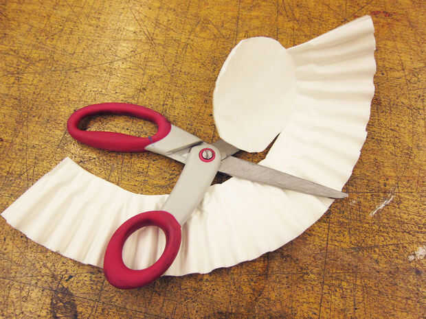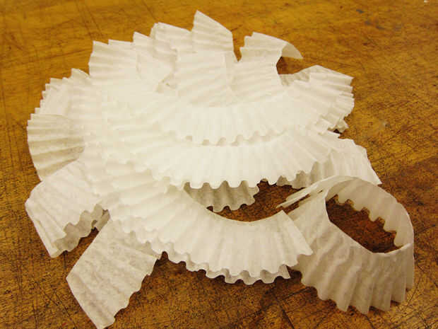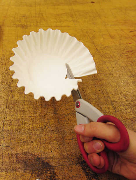 Que tenemos que hacer un montón y un montón de volantes para los paneles laterales. Comience tomando filtros de café no teñido y corte un agujero del centro del filtro, todo lo que no está plegado quitar.