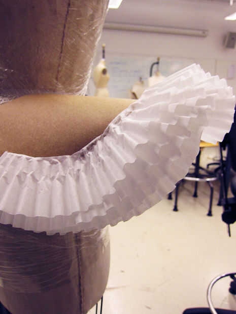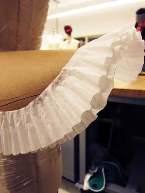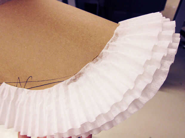 Vamos a empezar a colocar capas de volantes a los paneles laterales de la cadera, a partir de la punta exterior y nuestra forma de trabajo. A partir de la punta de la cadera lateral, ejecutar una línea de pegamento caliente en el borde y colocar las colmenas a lo largo de esta línea. Probablemente, así que cada colmena no es lo suficientemente largos, se superponen los y hacerlos mezclar.