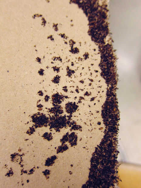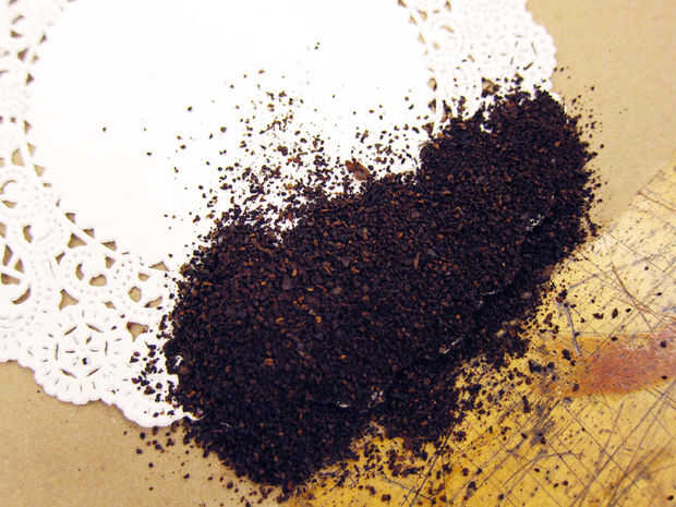 Tomando una carpetita que paso, colocar a lo largo del borde superior y usarlo como plantilla, dab cemento de goma en los orificios. Rápidamente quitar el tapete y vierta el café suelto sobre el pegamento.