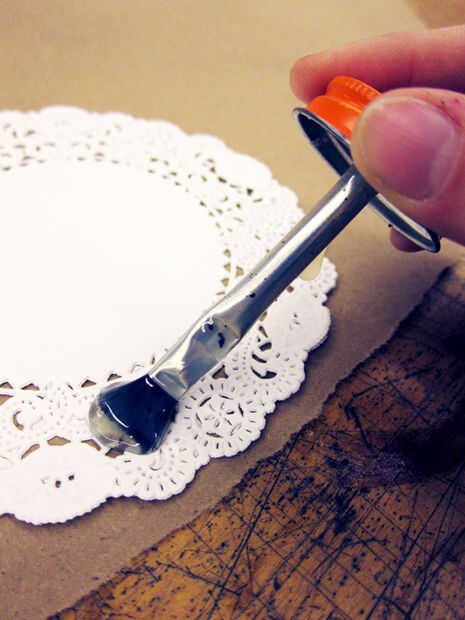 Deje secar y soplar los motivos del exceso. Debe dejar un patrón agradable, tipo encaje. Repita este proceso hasta que la parte entera superior está adornada con el cordón café.