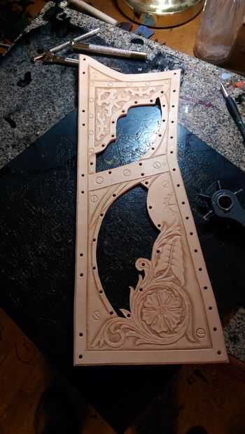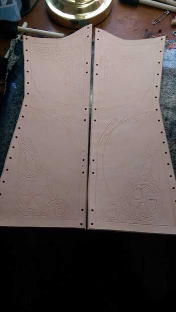 Después de cortar mis paneles y perforar los agujeros, comencé el proceso de mecanizado. Intenté utilizar curvar líneas y diseños que las líneas que siguió una áspera forma V para ayudar a exagerar las curvas de mi esposa. Para estos pasos utilicé un atomizador mojar el cuero, steampunk y SIDA de arte floral de tandy, un cuchillo del eslabón giratorio y varias de segundo plano, biselado y sellos florales y un mazo. Este instructable no pretende enseñarte a cuero útiles - que toma tiempo aprender, pero se puede ver el orden en que hice de todo.
