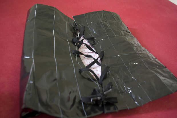 Cuando se tiene la forma que desee, tomar un sacador de agujero (o un clavo) y poner un número par de agujeros en el frente (5-10 por cada lado.) Ate para arriba y usted está listo para ir! (Bien, usted querer buscar algo que ponerte con ella, en primer lugar.)