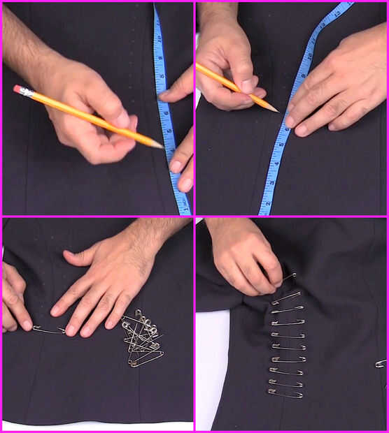 Utilizando sus dos conjuntos de puntos, pin en los pasadores de seguridad con el extremo del perno hacia el centro de la camisa, asegurándose de que tengan un espaciado uniforme.