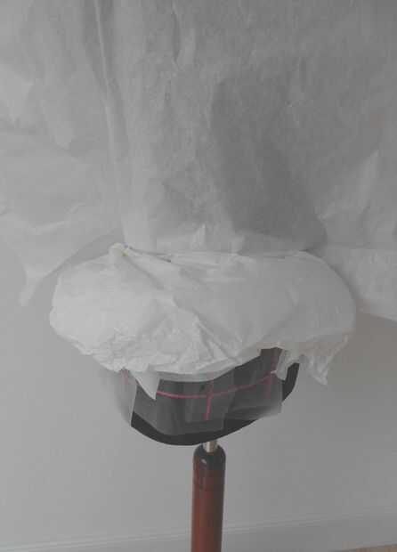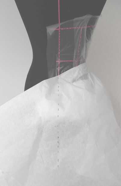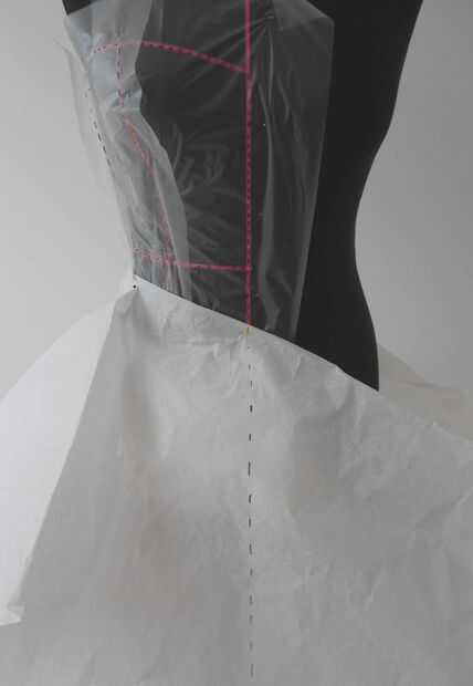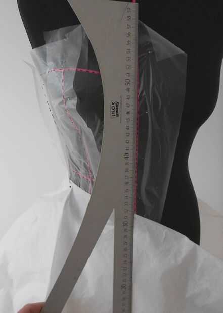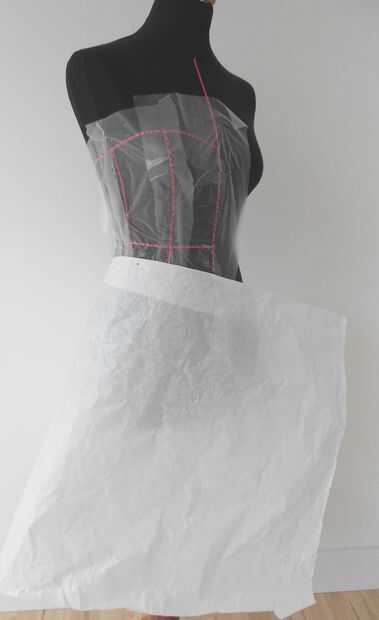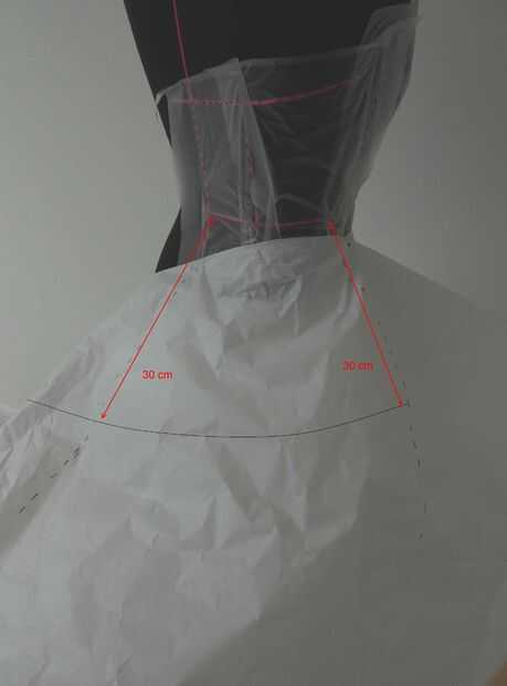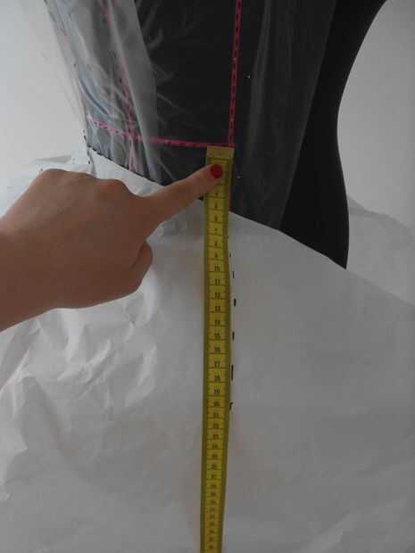 Now let' s move on to the skirt part. Como quisiera tener una falda acampanada, puse un papel debajo de la falda, para conseguir más ancho. Una vez que he cubierto mi falda con algún papel, alargado el centro delantero y centro de nuevo con una regla. Después decidí cuánto debe ser mi falda, me mide esta longitud de la cintura.