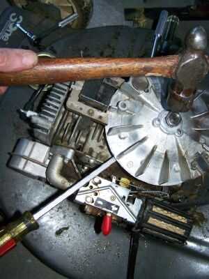 Use un destornillador largo para sacar desde abajo del volante. No levante demasiado. No quiere romper el cárter. Al mismo tiempo, golpee sólidamente en la tuerca. La tuerca protege los hilos de rosca. Girar el volante un cuarto de vuelta después de 3 o 4 grifos. Se aflojará más fácilmente de lo que cabría esperar. Cuando se suelta, retire la tuerca y sacar el volante.