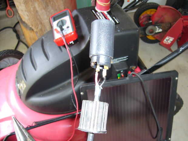 cortacésped con control remoto.  La plataforma del cortacésped es una 22 pulgadas Weedeater de WalMart.  Los motores de la silla de ruedas son méritos.  Los motores funcionar a 12 voltios y se recarga la batería por un alternador de GM.  La emisora e
