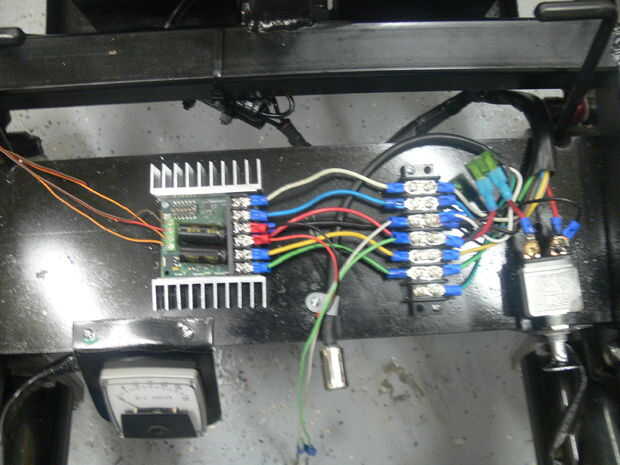 Ahora viene la diversión parte!  Es una buena idea para poner en una regleta de conexiones entre el poder y la Sabertooth 2 x 25. Esto aísla el interruptor y el fusible del regulador. Conecte el cable positivo del cargador al lado caliente del interruptor. Esto permite que las baterías a cargar con el interruptor. Conectar la energía y los cables del motor al controlador. Están bien marcados. Si los motores no gire en la dirección correcta, simplemente invierta el motor conductores. Mis motores tuvieron un par de hilos que accionado por un relé interno. Conectado estos encienda con el interruptor. En este momento "debe" configurar los interruptores DIP. Si no la unidad goes nuts cuando se aplica energía. Me puse a mina para dirección exponencial. Usted puede optar por depósito de dirección. (Lea las instrucciones de interruptor DIP que vienen con el controlador)