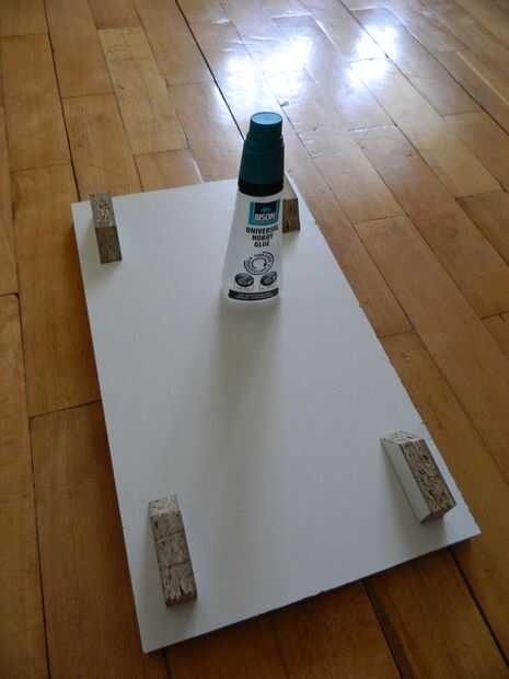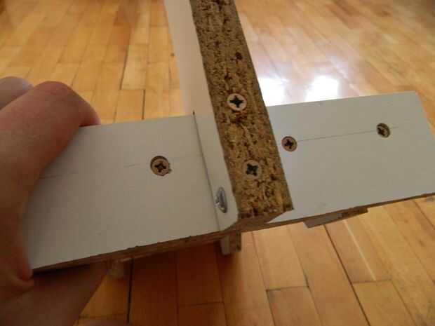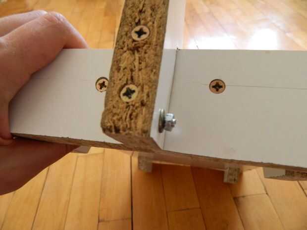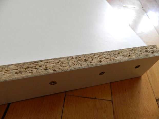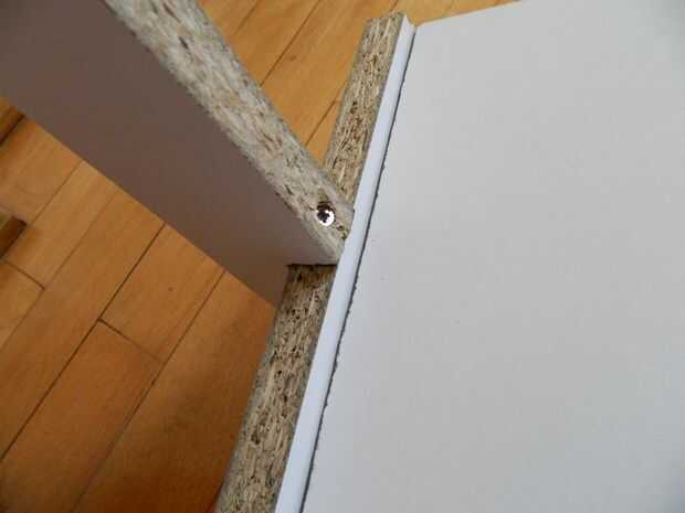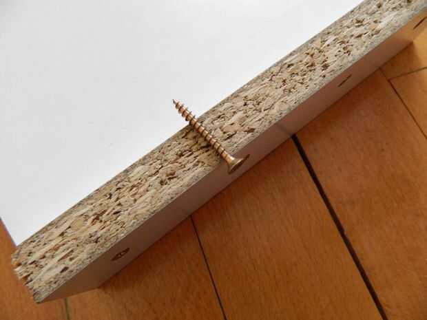 Yo he marcado la posición del brazo. Asegúrese de que permanece vertical y que apoye bien sobre el terreno. Al conducir los tornillos en el borde de la tabla, debe siempre perfore un agujero para que no tengas la Junta de división. Así que he remendada con otro tornillo tuerca y el perno que mantiene unida la mina split hacia la esquina. Es probablemente bueno usarlo de todos modos, porque el tablero de partícula es muy frágil en los bordes. He añadido otro tornillo diagonalmente en el lado opuesto (una perforación previa y usando el fregadero contrario demasiado).