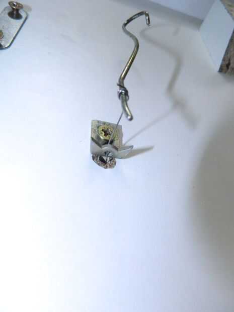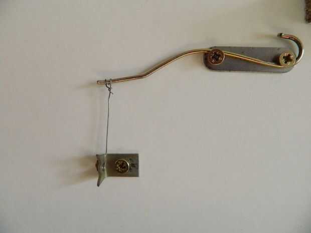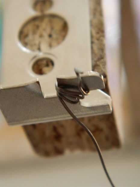 En primer lugar atar la parte superior del alambre. Correr el cable a través de la placa base y la placa de la esquina de metal y lazo a la primavera, dejando suficiente longitud del cable para que el resorte se mantengan tensos en todo momento. Luego puede poner el resorte detrás en su lugar. Debe estar bien doblada bajo la tensión del cable.